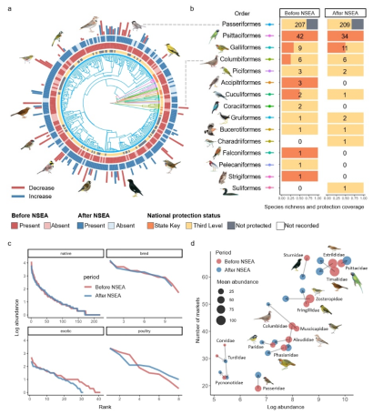 本研究发现,在全国执法专项行动后,市场中的鸟类总个体数显著下降。其中,受保护的鸟种个体数显著下降,从平均每个市场443只个体下降到242只个体,而未受保护的种类个体数显著上升。同时,本土野生鸟类的个体数也显著下降,而人工繁育的鸟种个体数显著上升。