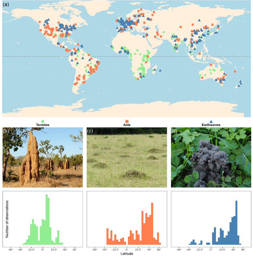 据估计,全球约59%的物种或短暂或终身生活在土壤。其中,白蚁、蚂蚁和蚯蚓在陆地生态系统中扮演极其重要的角色,曾被美国生物学家Edward O. Wilson教授誉为“主宰世界的小东西”(the little things that run the world)。它们可以通过土壤扰动产生独特的生物构造(如蚁丘和蚓粪),改变土壤微环境并为其他生物类群提供食物和栖息资源,因此被广泛认为是“生态系统工程师”。尽管学界已报道了三大无脊椎动物类群的生物量、多度和生物多样性的全球分布格局,然而目前尚未有研究对白蚁、蚂蚁和蚯蚓生态系统工程师效应的全球格局及环境驱动因子进行系统评估和探讨。