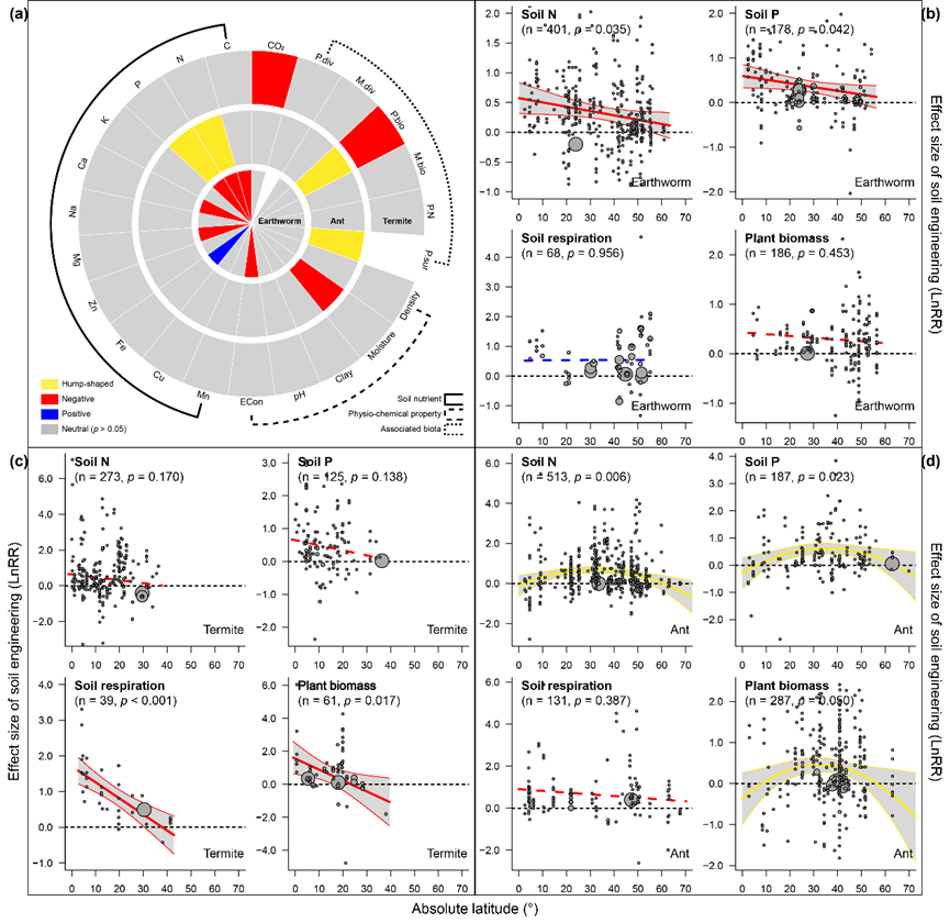 由太阳集团tyc86和水产动物疫病防控与健康养殖全国重点实验室领衔的国际团队在Nature期刊发表题为“Global engineering effects of soil invertebrates on ecosystem functions”的研究论文。该荟萃分析发现在全球尺度上三大无脊椎动物类群的土壤扰动作用可以提升土壤主要养分含量、土壤呼吸速率、微生物生物量以及植物生物量。随着年均温的升高,白蚁对土壤呼吸和植物生物量、蚯蚓对土壤氮磷含量的促进作用均随之提高。不同的是,蚂蚁对土壤氮磷含量、植物生物量和植物存活率的促进作用随净初级生产力升高而降低,并在中纬度地区达到峰值。进一步分析表明,白蚁通过缓解热带地区磷养分限制进而促进植物生长,蚂蚁则通过缓解温带地区氮养分限制促进植物生长。