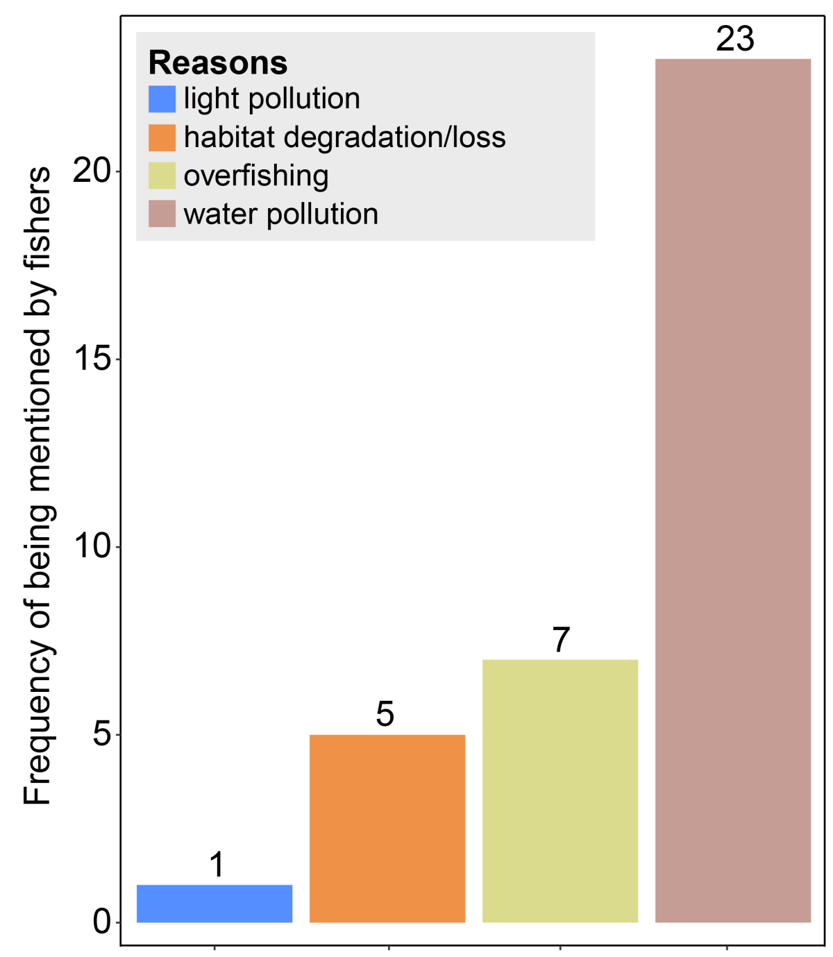 超过一半的渔民(63.9%)认为工业/生活污水是种群衰退的主要原因,其次是过度捕捞(19.4%)和栖息地退化/丧失(13.9%),尤其强调沿海开发导致的沿岸沙质产卵场被破坏(图7)。
