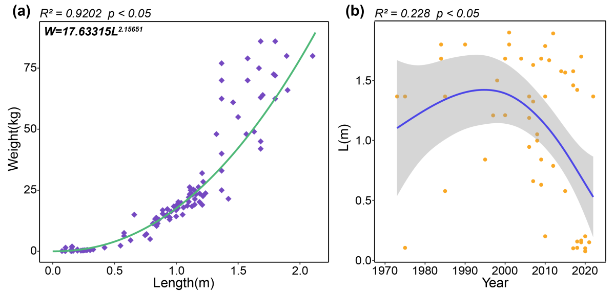· 体型持续小型化:1995年后体长显著下降(p<0.05;图3),平均体重也呈下降趋势(图4b)。