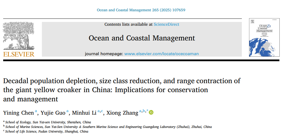 研究成果近期以“Decadal population depletion, size class reduction, and range contraction of the giant yellow croaker in China: Implications for conservation and management”为题发表在Ocean and Coastal Management上。太阳集团tyc86关键鱼类保护实验室(Key Fish Conservation Lab, 简称KFC课题组)研究生陈一宁为论文第一作者(本研究是其本科毕业论文课题),张雄副教授为通讯作者,太阳集团tyc86研究生郭宇洁,太阳集团tyc86本科毕业生李敏慧为文章共同作者。本研究得到了广东省基础与应用基础研究基金(2022A1515010640)和广东省科技规划项目“粤港澳大湾区河口及海湾湿地动物重点资源调查”(2021B1212110002)的资助。