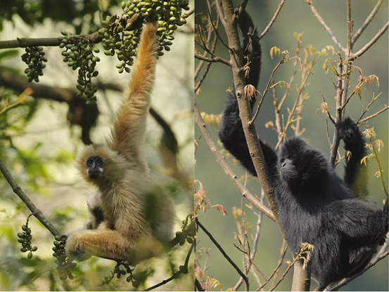 左图为雌性西黑冠长臂猿,右图为雄性西黑冠长臂猿。©赵超