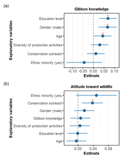 图3 最终模型中解释受访者长臂猿知识水平(a)和对野生动物态度(b)的解释变量。