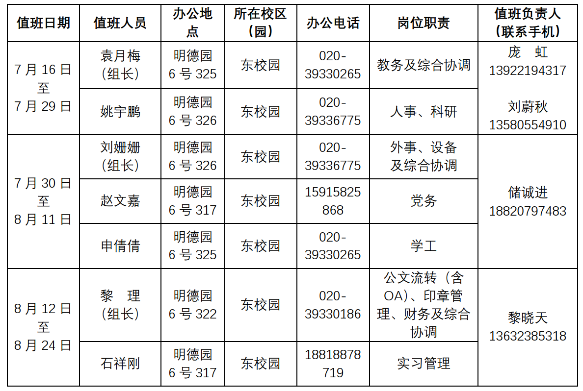 2.党政管理人员(含辅导员)、教辅人员等,应在师生放假期间保证学校各项工作的正常开展,为教学、科研工作提供正常的保障和服务,在此前提下安排轮休。学院假期值班安排见下表:
