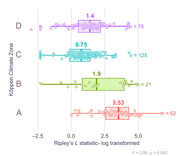 Fig. 2 Conspecific spatial aggregation statistics (Ripley’s L statistic) across the four Koeppen Climate zones. The figure captures the massive effect of climatic variables on conspecific spatial aggregation patterns of trees.