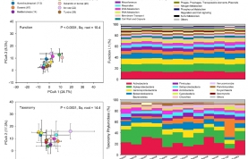 保护微生物群落的多样性对维持陆地生态系统功能有重要的意义。通过研究土壤微生物群落物种和功能的多样性差异,我们可以探索全球变化如何影响微生物群落组成与其执行的生态系统功能之间的联系。基于全球土壤微生物宏基因组数据,我们分析了17个气候带之间土壤微生物群落在物种组成和功能特征的beta多样性,结果发现微生物宏基因组功能特征在地域间差异要小于物种组成(图1),说明土壤微生物群落的种群多样性要大于功能多样性。