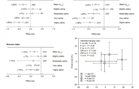 全球海平面上升引起的土壤盐度升高正威胁滨海陆地生态系统,而土壤微生物可以驱动陆地生态系统碳氮循环的动态变化,因此科学预测土壤微生物群落组成和多样性对盐度升高的响应机制,对保护滨海陆地生物多样性和土壤碳储量具有重要意义。因此,基于全球来自21篇高通量测序文章的土壤微生物群落组成和多样性数据,我们分析了土壤盐度升高对古菌、细菌和真菌的alpha和beta多样性以及门和纲分类组成丰度的影响。 结果发现,随着土壤盐度升高,细菌alpha多样性的丰富度指数显著降低了23-28%,均匀度指数下降12%,并且土壤盐度上升10 ppt能显著改变土壤原核微生物的beta多样性(图1)。