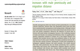 近日,我院刘阳教授团队以“Divorce rate in monogamous birds increases with male promiscuity and migration distance”为题在国际生物类综合期刊Proceedings of the Royal Society B:Biological Sciences(皇家学会学报)发表有关鸟类婚配制度的最新研究成果(图1)。本研究通过系统发育比较分析方法,在232种社会性单配鸟类中发现,雄性多配个体的比例越高,或迁徙距离越长,该物种的离婚率越高;并通过系统发育路径分析,揭示了迁徙距离、死亡率等因素与离婚率存在的间接关联。该结果表明:鸟类的离婚行为可能既非雌雄双方为提高繁殖成效的适应性策略,也非因意外失散配偶导致的随机事件,而是上述主客观因素共同作用的结果。
