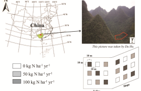 氮饱和理论指出:如果一个生态系统持续接收外源氮输入,则该生态系统可能由氮限制转为碳、磷或其他限制。但是氮限制解除后,到底哪个元素才是最主要的限制元素,同时地形因素是否会影响这个结果,则很少在微生物水平上探讨。我们在广西喀斯特地区选择了一个氮饱和的森林,在其两个不同地形部位(坡地和洼地)上分别建立了长期氮沉降模拟样地(图 1),进行了为期两年的氮添加实验,测定了土壤中碳氮磷循环相关的酶活性,利用酶化学计量法作为微生物养分限制的指标,研究了氮沉降对微生物养分限制性的影响。